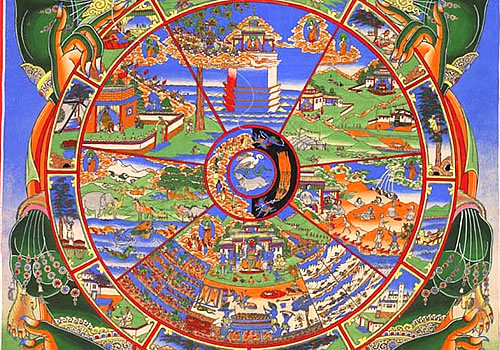 Rad symbolisiert den ewigen karmischen Kreislauf von Tod und Wiedergeburt. Erst